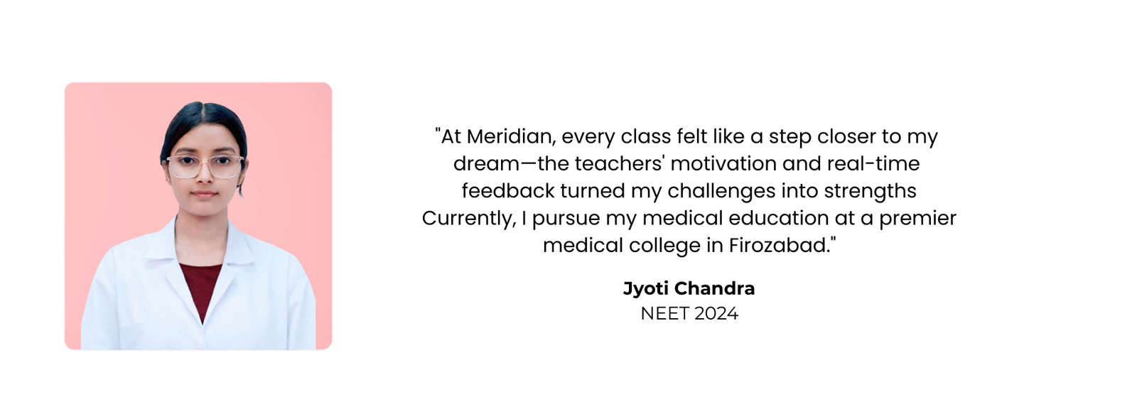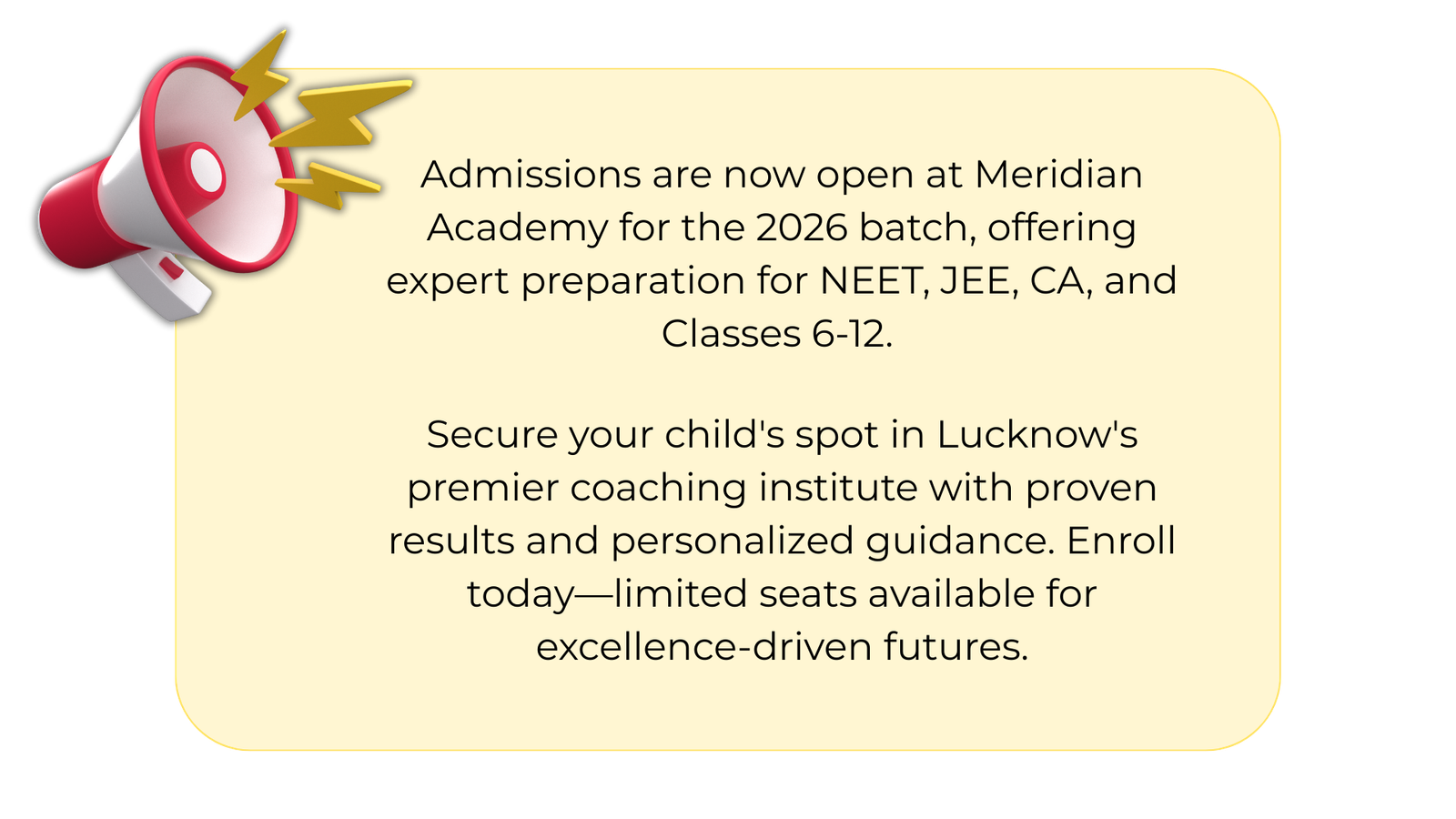 India's premier coaching academy empowering top selections nationwide! 5+ Years Of Excellence Lucknow's Best Institute Ranked #1 In Competitive Exams Results Driven Mentor Foundation JEE NEET Why Meridian Leads the Way ? Our Latest Announcements Meridian Star's Success Stories Our Results Our Results reflect the dedication, hard work, and passion of our students, leading to outstanding selection rates in competitive exams like NEET, JEE, and CA.